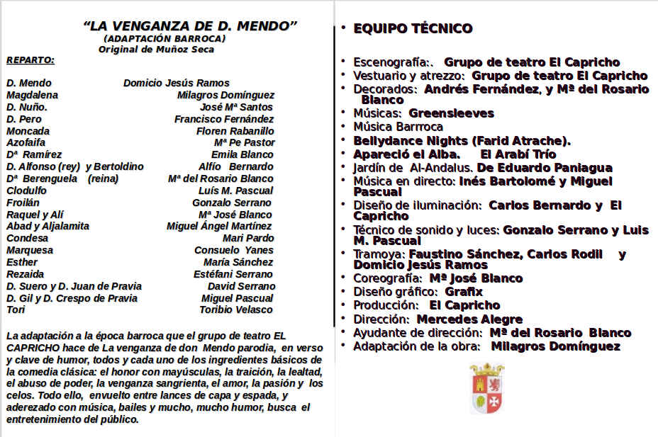 Sinopsis: La adaptación a la época barroca que el grupo de teatro EL CAPRICHO hace de La venganza de don Mendo parodia, en verso y clave de humor, todos y cada uno de los ingredientes básicos de la comedia clásica: el honor con mayúsculas, la traición, la lealtad, el abuso de poder, la venganza sangrienta, el amor, la pasión y los celos. Todo ello, envuelto entre lances de capa y espada, y aderezado con música, bailes y mucho, mucho humor, busca el entretenimiento del público.